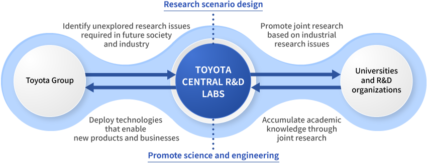 As a research institution that advances science and engineering in an integrated manner, we develop research scenarios based on issues required by society and industry and that adhere to cutting-edge academic trends and establish research themes to be addressed. Based on this approach, we develop research competencies and the knowledge required for the coming era by collaborating with various universities and research organizations. The technologies developed through these collaborative efforts will be steadily linked to social implementation with Toyota Group companies.