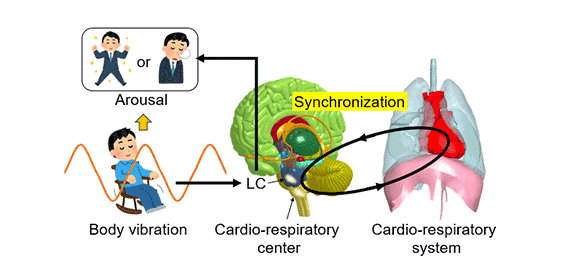 Slow rocking chairs can easily put people to sleep, while violent shaking, such as during earthquakes, may lead to rapid awakening. However, the influence of external body vibrations on arousal remains unclear. We developed a computational model of a locus coeruleus (LC) controlling arousal levels and cardio-respiratory system, and simulated activity of LC and cardio-respiratory changing by various vibration inputs. We found that respiratory entrainment of the LC maintained heart rate within its normal range and increased the breathing rate (BR) and arousal level with lower frequencies, while it decreased the BR and arousal level with higher frequencies, especially in vibrations with larger amplitudes. These findings suggest that respiratory entrainment of the LC might automatically modulate cardio-respiratory system homeostasis and arousal levels for performance readiness (fight/flight or freeze) to avoid physical risks from larger external vibrations. Our model can be used to investigate the effects of external body vibrations on human health and performances.