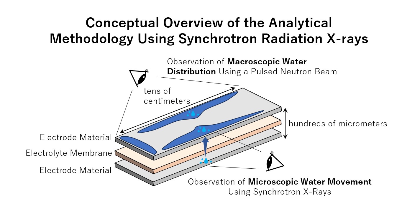 - A world-first observation technique was employed, integrating a large-area pulsed neutron beam and high-resolution synchrotron radiation X-rays. This technique was utilized to analyze the distribution and movement of water inside large automotive fuel cells.