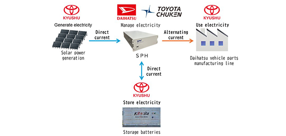 As part of this field-test, a microgrid system that efficiently utilizes electricity was built at TOYOTA KYUSHU Kokura Plant. This system uses the SPH jointly developed by TCRDL and DAIHATSU to supply electricity generated by solar power to the parts manufacturing line, while storing surplus electricity in storage batteries. The effectiveness and reliability of the system will be confirmed through verification with an actual operating manufacturing line. In the future, this system will contribute to reducing CO2 emissions by enabling the local production and consumption of energy, as well as peak shifting, where electricity stored during the day is used at night.