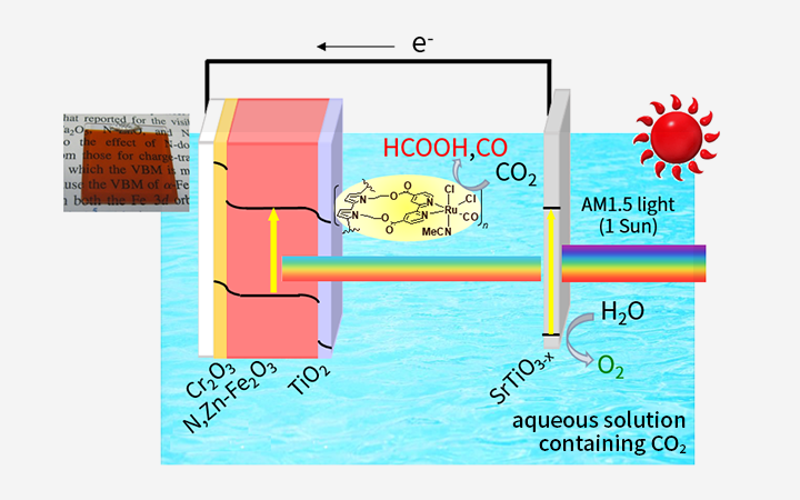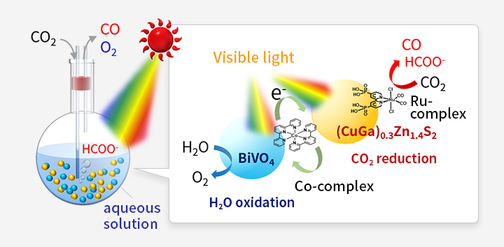 The photosynthesis that occurs in plants generates organic compounds from water (H2O) and carbon dioxide (CO2) using sunlight, such that solar energy is stored in the form of chemical energy. Our group has researched artificial photosynthesis systems capable of proceeding under visible light irradiation, in which electrons (e-) and hydrogen ions (H+) are extracted from water, leaving dioxygen (O2). These species are subsequently involved in the reduction of CO2 to synthesize organic substances. We have previously demonstrated a new method that combines the unique characteristics of a metal complex catalyst (intended to promote the reduction of CO2), an inorganic catalyst (for the oxidation of water) and a semiconductor (for visible light absorption). As an example, a so-called artificial leaf device was shown to store solar radiation in the form of chemical energy by producing formic acid (HCOOH), with a conversion efficiency exceeding that of plants.