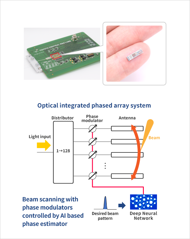 Sensing technologies that detect a vehicle’s surrounding environment are essential for automated driving that enhance the safety and convenience of drivers. LiDAR has attracted attention as a key sensor that simultaneously enables ranging and object detection based on time of flight between light emitter and an object. Having mechanical moving parts, however, LiDAR systems present a variety of issues, including the need for miniaturization. We are therefore working on a phase control technology that applies an optical phased array to scan light beams while controlling the phase of the light radiated from an optical antenna, and that utilizes a Deep Neural Network to flexibly respond to the temperature of devices and other operating conditions. Electronic scanning technologies that eliminate the need for mechanical moving parts will further advance miniaturization and cost reductions and are therefore expected to expand the application of environmental sensing to factory logistics systems and a variety of other applications besides automated driving.