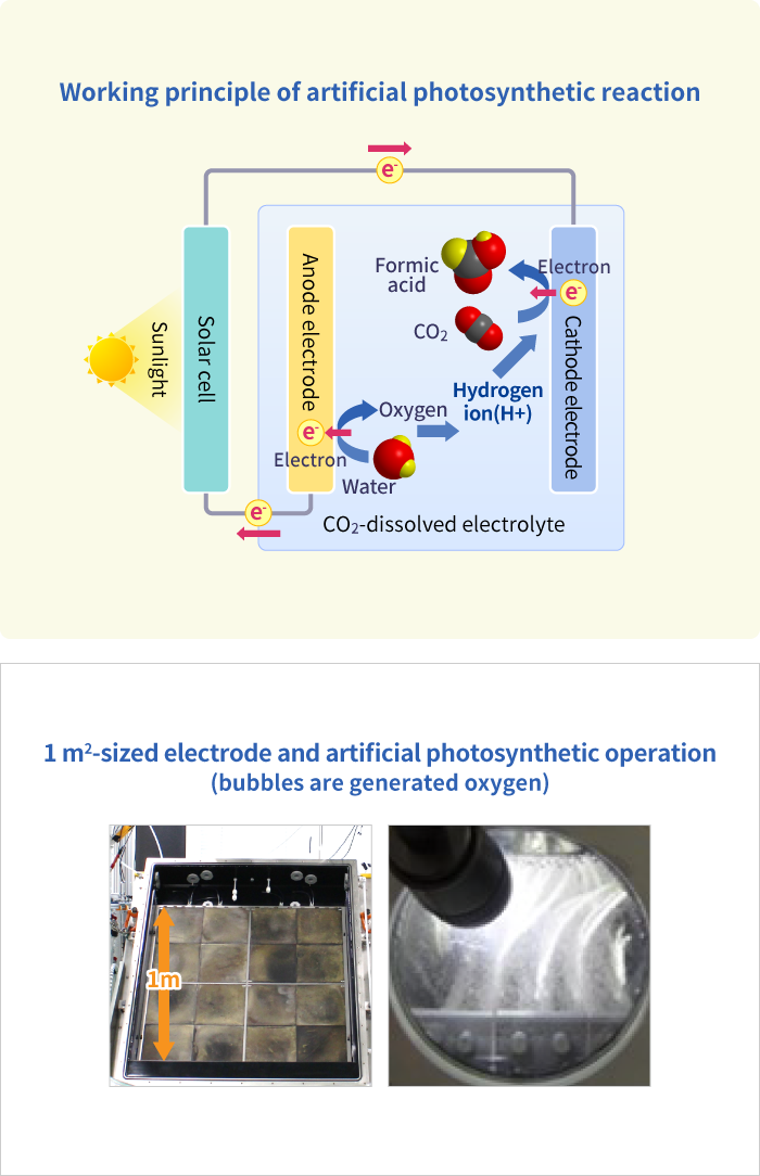 Artificial photosynthesis converts CO_{2} to organic substances using only H_{2}O and sunlight, and hence enables the recycle of emitted CO_{2} . We have established an artificial photosynthesis technology that continuously produces formic acid –an organic substance– from CO_{2} dissolved in an electrolyte at normal temperature and pressure. We constructed a 1m~{2}-sized artificial photosynthetic cell, and demonstrated a solarto-chemical conversion efficiency of 10.5% that is the world record for large sized cells. We employed the combination of crystalline silicon solar cells and an electrochemical reactor loading original catalyst, and then optimized the electron transport and electrolyte flow to achieve both a practically large size and a high efficiency.