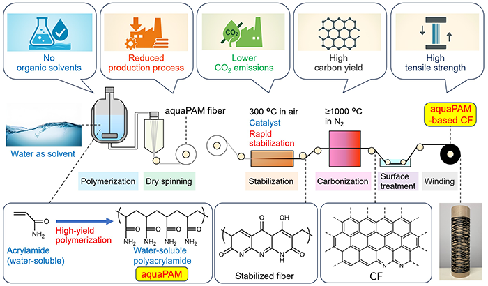 Furthermore, carbonized aquaPAM-based CFs exhibit tensile strength and modulus comparable to those of PAN-CFs, and the developed process generates fewer CO2 emissions than PAN-CF production.