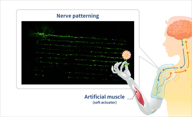 Quality of life declines dramatically when the five senses or bodily functions are partially lost due to age, accident, or illness. Although braces and monitoring devices that compensate for reduced functioning, for example, have been commercialized, issues remain from the perspective of improving wearability and reproducibility. With the goal of dramatically improving compatibility with living organisms and the reproducibility of human senses, we aim to create sensors that employ the high-speed information processing and transmission systems possessed by nerves, as well as biological function amplification and restoration devices that connect nerve cells with semiconductor devices.