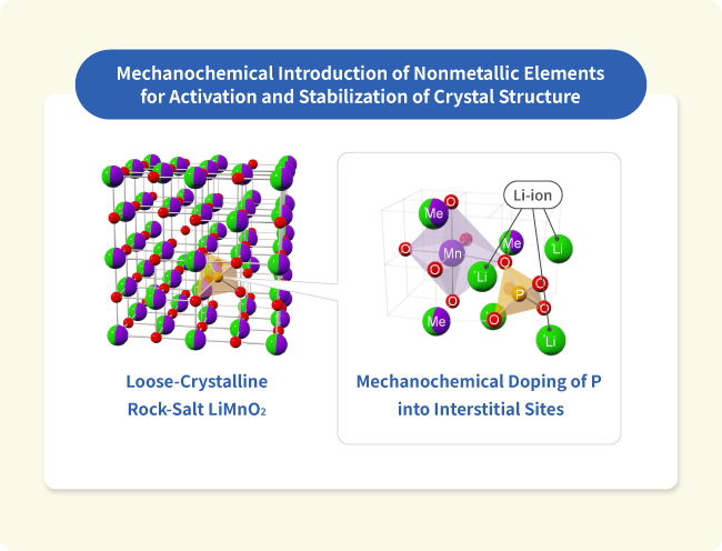 For example, we have explored alternatives to cobalt and nickel species, both of which are commonly used as positive electrode materials in high-performance lithium-ion batteries. We focus on manganese species as sustainable alternatives and have demonstrated in small-sized batteries that lithium manganese oxides incorporating non-metallic elements such as boron or phosphorus into their crystal lattice can exhibit high capacity and extended cycling life.
