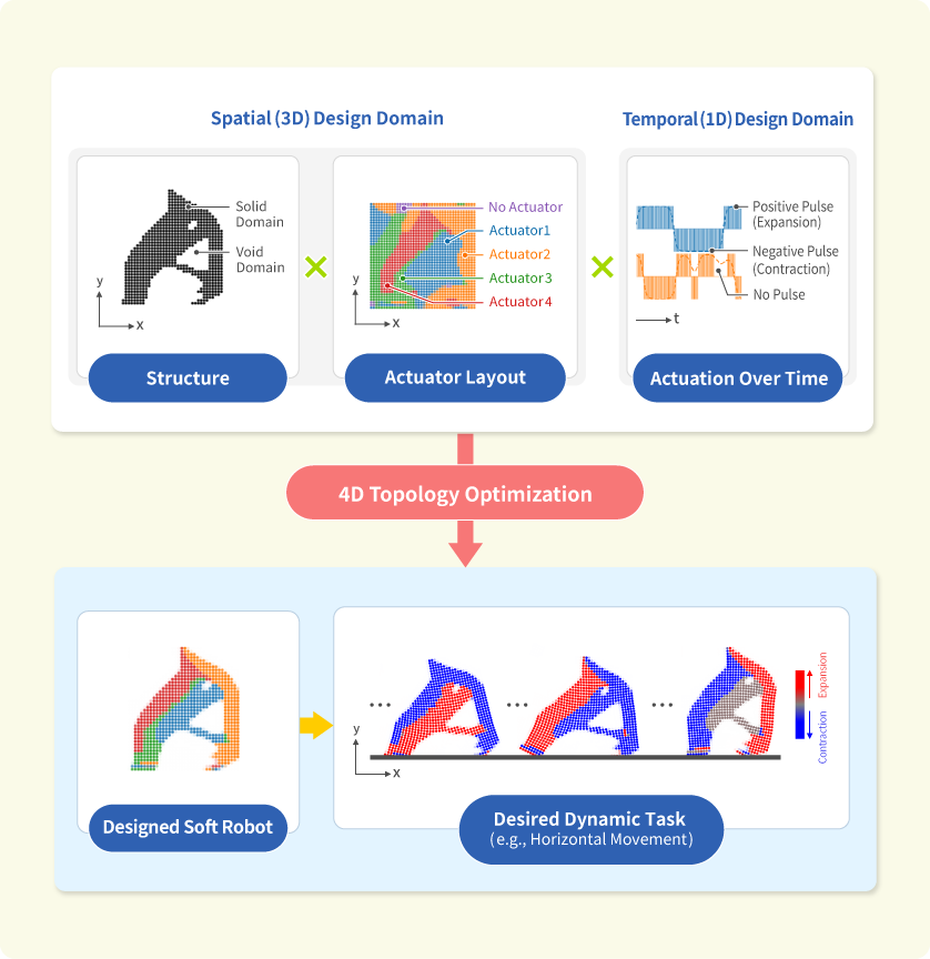 For example, we applied 4D topology optimization to the design of soft robots made from flexible, rubber-like materials. Soft robots are increasingly gaining attention due to their inherent safety in collisions and adaptability to different environments.