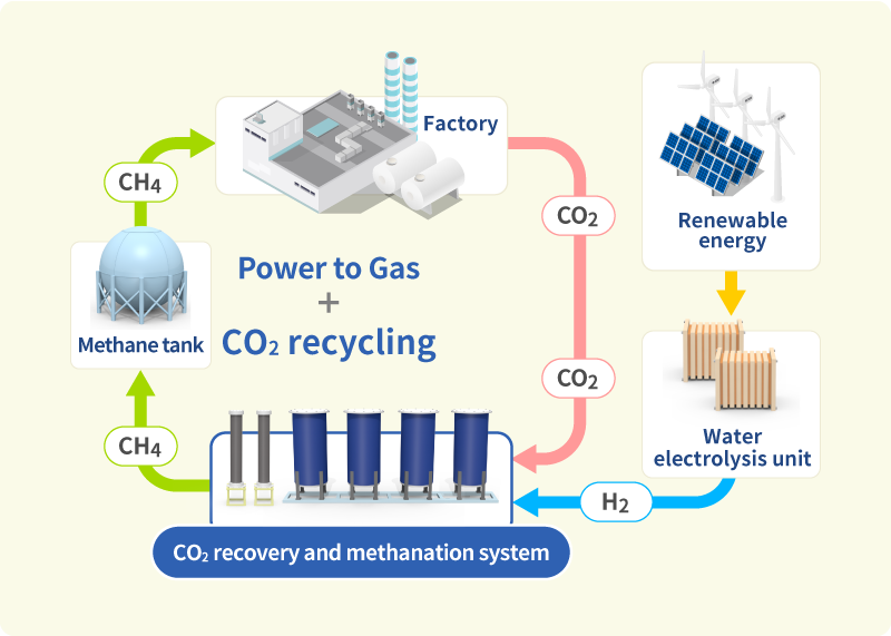 We are working to construct a CO_{2} recovery and methanation system (C-LOOP®) . Specifically, this system synthesizes methane from CO_{2} recovered from production facility exhaust gases and hydrogen derived from renewable energy. Along with an energy management technology for balancing CO_{2} emissions, which vary depending on the operating status of facilities, with hydrogen generation, which varies depending on fluctuations in renewable energy power, the system efficiently employs CO_{2} recovery and storage to realize stability throughout the system.