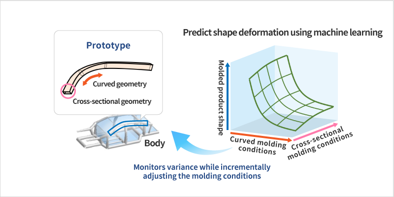 In general, prototyping a car body requires a significant amount of time to produce actual prototypes from the design data of new parts. For example, in press molding, changes that occur in a prototype's shape when it is released from the die depend on the rigidity of the die and the processing condition, meaning multiple prototypes are required to produce the shape exactly as specified by the design data. We are therefore developing a molding technology that eliminates the need for any prototypes by using machine learning to predict the shape changes during the molding process, and by constructing a system that can adjust the molding conditions incrementally while monitoring the variance between the design data and the prototype.