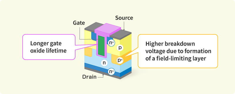 We work to develop the next-generation power device technologies that will be key to increasing electric vehicle range and to reducing the size and weight of the PCUs~{*1} used to control power. We have already developed and put into practical use SiC power semiconductors that achieved both longer lifetime, and high voltage/current operations through the realization of an original trench gate structure. Similarly, we have developed device technologies that enable high-precision battery charge and discharge status control using a small number of IC chips. We also actively promote collaborations with Toyota Group companies and academic institutions in aims of further reducing power loss and of improving productivity.