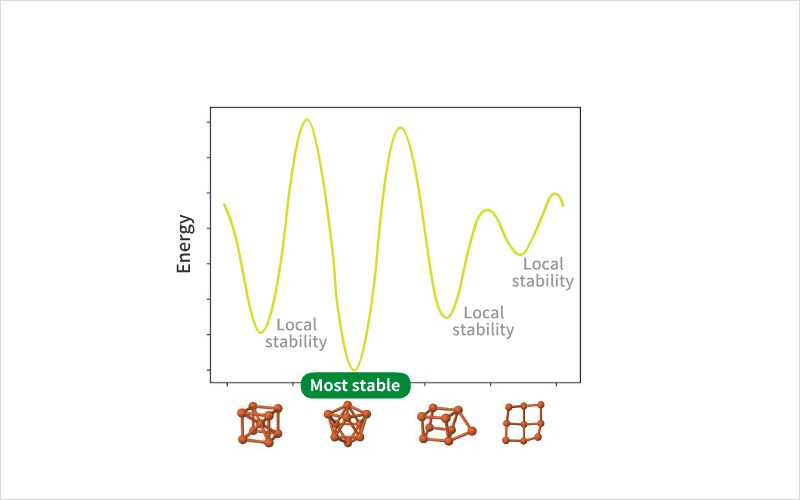 Conceptual image of a material design calculation using quantum computing to explore the most stable structure
