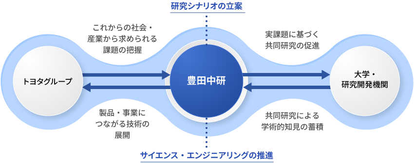 私たちはサイエンスとエンジニアリングとを一体となって推進する研究機関として、社会や産業から求められる課題と最先端の学術動向に基づいて研究シナリオを立案し、取り組むべき研究課題を設定しています。それに基づき、トヨタグループをはじめ様々な大学や研究開発機関と連携することで、これからの時代に求められる研究力や有用な知見を蓄積していくことを目指しています。そしてこのような取り組みを通して培った技術は、トヨタグループを通じて社会実装へと着実につなげていきます。