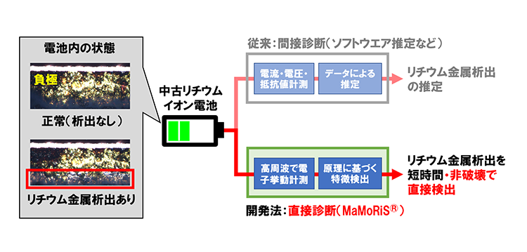 本技術は、統計的データ処理や機械学習を用いて間接的に検出する技術とは異なり、リアルタイムかつ非破壊でLi金属の析出を直接的に検出できるため、リユースなどLiBを長期間利用する際に求められる、電池の状態の健全性をセンシングする技術として期待されます。