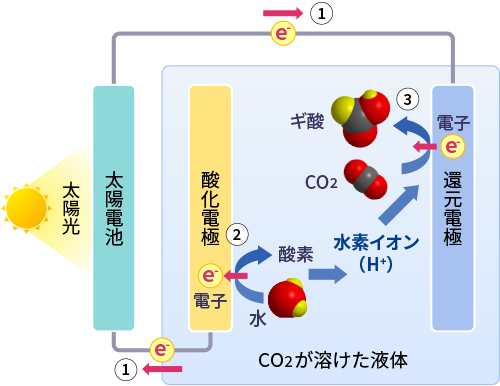 - 還元電極で水素イオン(H~{+})と二酸化炭素(CO_{2})、電子(e~{-})の反応によりギ酸(HCOOH)を生成