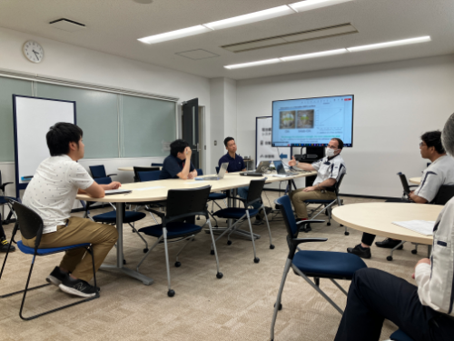 図2. 材料分析討議会の様子。オンラインとのハイブリッド開催で、30人程度集まって活発な議論が行われる。