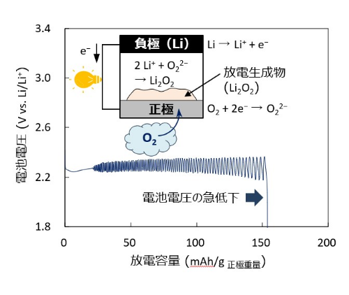 図1. リチウム空気電池の定電流放電曲線。電池電圧が急低下する直前に現れる電池電圧の振動と、リチウム空気電池の放電反応の模式図(グラフ内)。