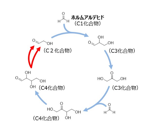 図2. 糖合成反応(ホルモース反応)の自己触媒反応サイクル。C4化合物からC2化合物が生成する反応経路を赤矢印で示した。