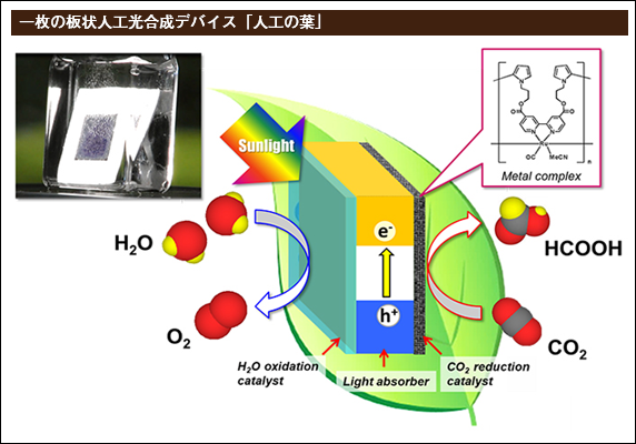 地球温暖化抑制のため、CO_{2}排出量の削減、固定化が強く求められています。その一方で、化石燃料を使わずに有機物を生成することは極めて困難です。この課題に対し、植物の光合成システムを模倣する研究はこれまでも盛んに行われてきました。しかしながら、大気中のCO_{2}と水を原料に、太陽光のみをエネルギー源としてCO_{2}を還元する「完全な」人工光合成の達成は困難と考えられていました。