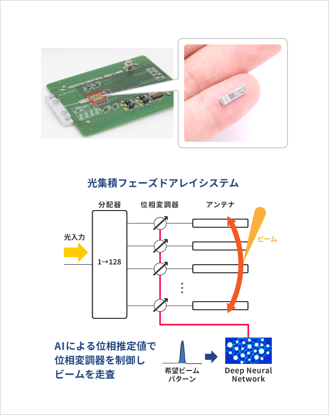 自動車の予防安全性能や利便性を高める自動運転では、周囲の状況を検知する環境センシング技術が不可欠です。照射光 が対象物で反射して戻ってくるまでの時間に基づいて測距と物体検出とを同時に実現するキーセンサとしてLiDARが注 目されてきました。しかしながら機械的な可動部を有するLiDARは小型化が必要であるという課題がありました。私たち は光アンテナから放射される光の位相を制御して光ビームを走査する光フェーズドアレイを応用すると共に、素子の温度な ど使用条件に柔軟に対応させるためDeep Neural Networkを用いた位相制御技術にも取り組んでいます。機械的な 可動部のない電子走査技術により小型化と低コスト化が更に進み、自動運転以外にも工場内の物流システムなどさまざま な場面での応用拡大が期待されます。
