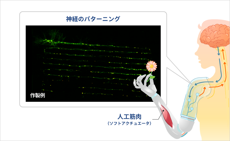 人工的な神経のパターニングとソフトアクチュエータによる生体増幅/回復のイメージ