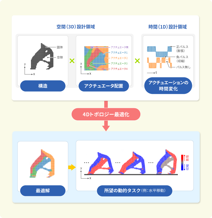通常のトポロジー最適化は、物体の形状など三次元の構造を最適化するものですが、4Dトポロジー最適化では、時間の経過に伴う形状の変化も考慮することで、物体がどのように動くかを含めた最適化をも実現しました。