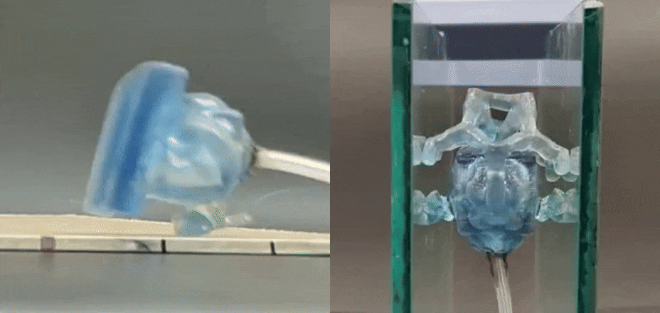 さらに、ロボットが生物のように移動、回転、姿勢の制御を行うための、胴体や脚のような複雑な構造が創発的に設計可能なことを示すとともに、空気圧で動くソフトロボットを試作し、実際に機能することを確認しました。