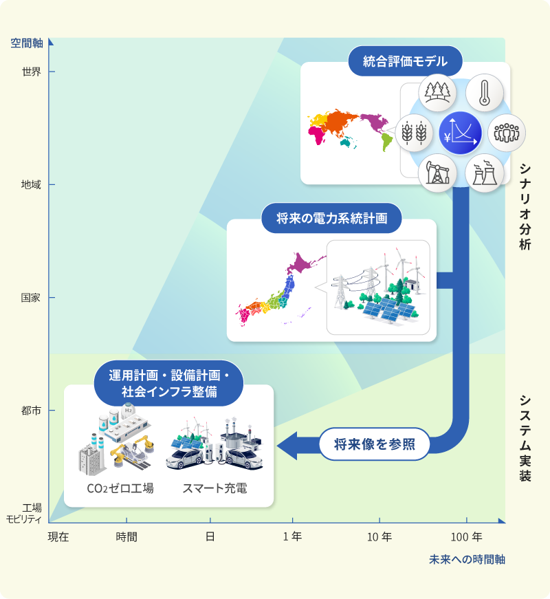 このアプローチにより、様々な施策や技術が社会や自然に与える影響をシミュレーションし、将来について客観的な議論を行うための情報を提示することが可能になります。例えば、エネルギーの運用計画や設備計画、電動車の利便性を向上させる社会インフラの整備など、技術開発の指針を検討するための基盤構築に取り組んでいます。