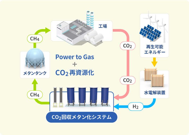 生産設備の排気ガスから回収されたCO_{2}と再生可能エネルギー由来の水素からメタンを合成して、エネルギー源として循環利用するCO_{2}回収メタン化システム(C-LOOP®)の構築に取り組んでいます。設備の稼働状態に依存するCO_{2}の排出量と、再エネ電力の変動に依存する水素の生成量とをバランスさせるためのエネルギーマネジメント技術と共に、CO_{2}の回収・貯蔵を効率的に運用することでシステム全体の安定化を実現しています。