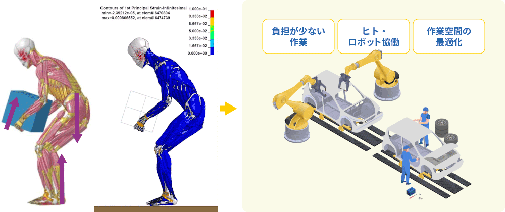 工場の各工程におけるヒトの動作のセンシングに基づき、筋・骨格などの動きを模擬したヒューマンモデルを用いて、作業負荷や難易度を定量化する技術に取り組んでいます。それを活用して、ヒトとロボットとの協働作業分担や作業者の負担が少なくなるように、作業空間の最適化が図れる技術の確立を目指しています。これにより、ヒトにやさしく生産性を高める作業空間のデザインや生産工程の編成を支援します。
