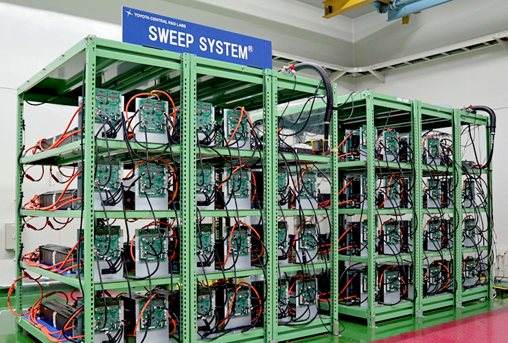 電動車の普及により発生する中古電池を無駄なく再利用・再資源化する技術が求められています。私たちは中古電池を複数繋ぐことで一つの大容量蓄電池として再利用可能にすると共に、劣化の度合いや性能が異なっていても充放電を効率よく行う制御機能(SWEEP SYSTEM®)の開発を進めています。さらには電力業界とも連携して実証実験を行うことで、再生可能エネルギー導入のための電力バッファへの活用の可能性も探索しています。